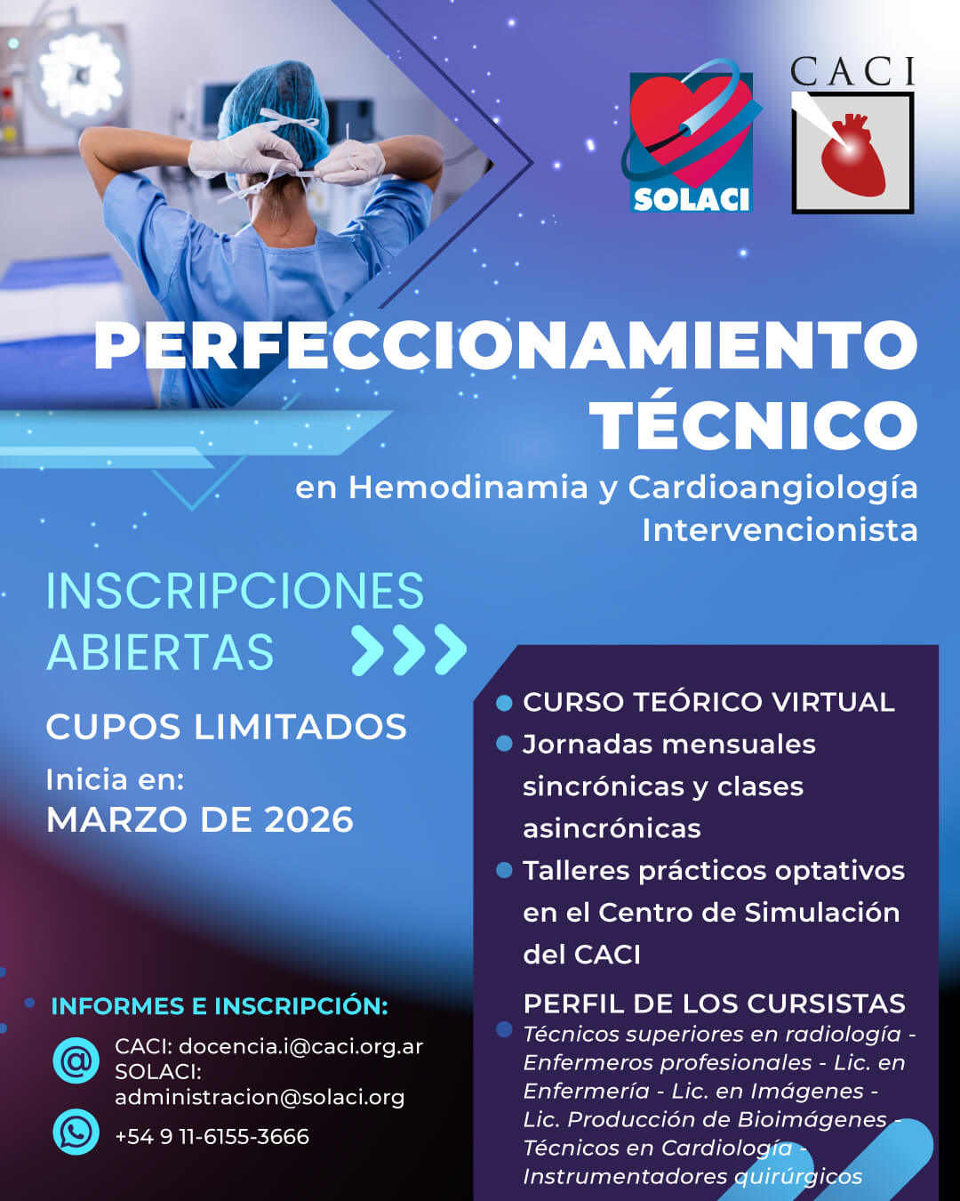 Esta capacitación ofrece una oportunidad única para actualizar conocimientos, adquirir herramientas prácticas y potenciar el desempeño profesional dentro del equipo intervencionista, con el respaldo académico de SOLACI y CACI.
