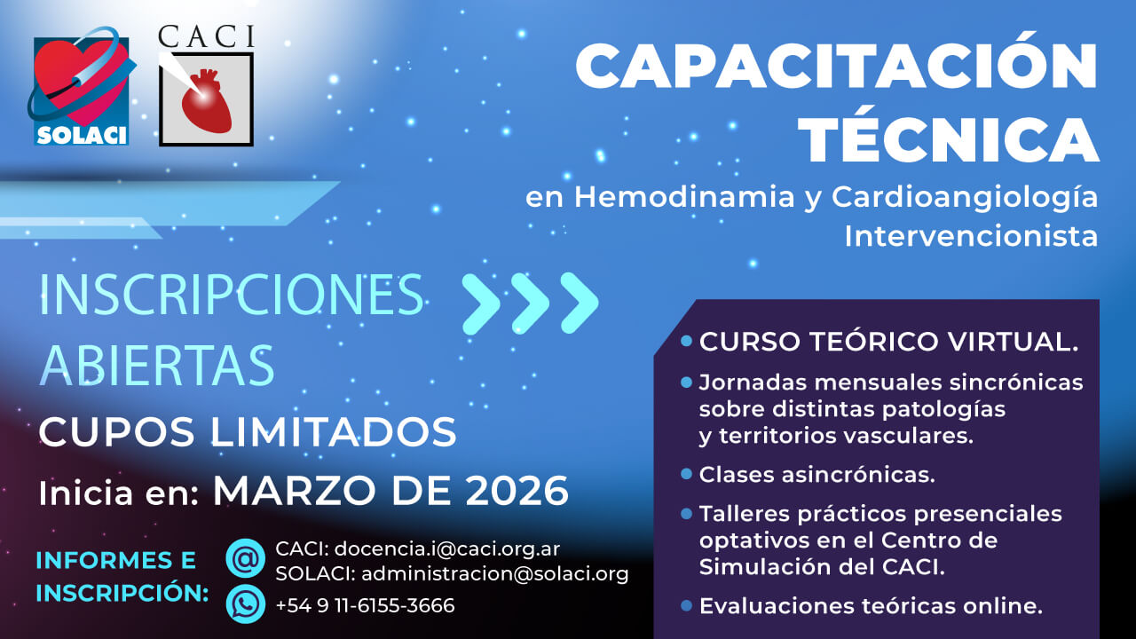 La Capacitación Técnica en Hemodinamia y Cardioangiología Intervencionista SOLACI–CACI es un programa académico diseñado para la formación inicial y la actualización profesional del personal no médico que integra los Servicios de Hemodinamia. La propuesta combina contenidos teóricos actualizados con una modalidad flexible, orientada a fortalecer el rol del equipo técnico dentro del intervencionismo cardiovascular moderno.