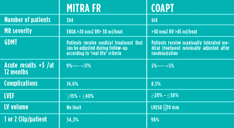 After looking at the table, the most important conclusion is that the COAPT trial selects patients far less evolved, uses more experienced operators, and practically the same medical treatment during follow-up.