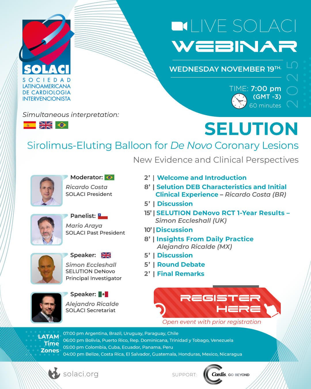 Our webinar “SELUTION: Sirolimus-Eluting Balloon for De Novo Coronary Lesions – New Evidence and Clinical Perspectives”, held on November 19, 2025 via Zoom with the support of Cordis, is now available to watch.