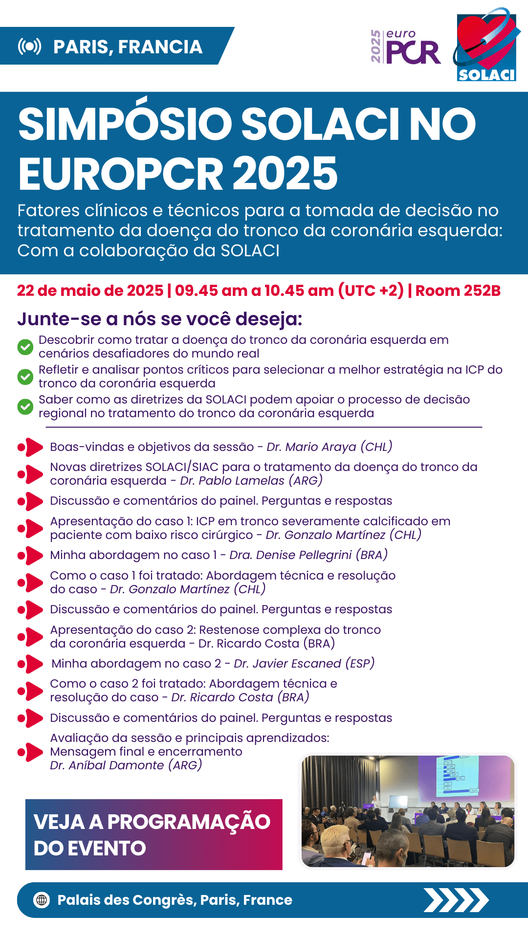 A Sociedade Latino-Americana de Cardiologia Intervencionista (SOLACI) marca presença mais uma vez em um dos congressos mais importantes da especialidade a nível mundial. Nesse sentido, a Sociedade participará do Congresso EuroPCR 2025 (que será realizado em Paris, França, entre os dias 20 e 23 de maio) com uma sessão conjunta sobre “Fatores clínicos e técnicos para a tomada de decisões no tratamento da doença do tronco da coronária esquerda.”