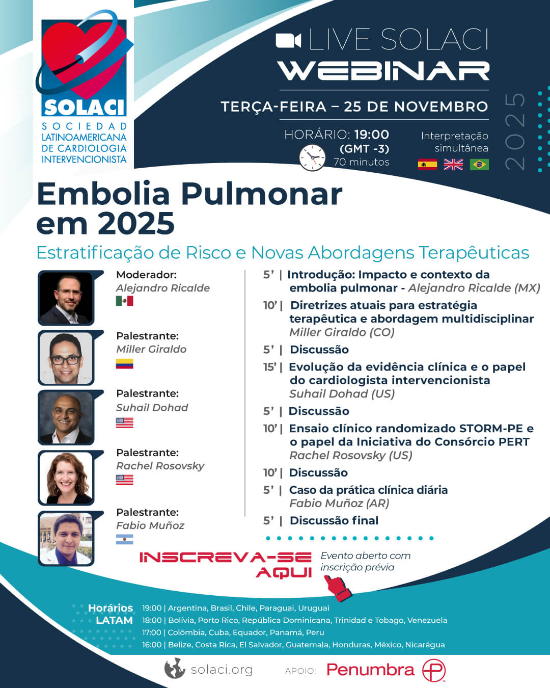 Já está disponível para assistir o nosso webinar “Embolia Pulmonar em 2025: Estratificação de Risco e Novas Abordagens Terapêuticas”, realizado no dia 25 de novembro de 2025 via Zoom, com o apoio da empresa Penumbra.